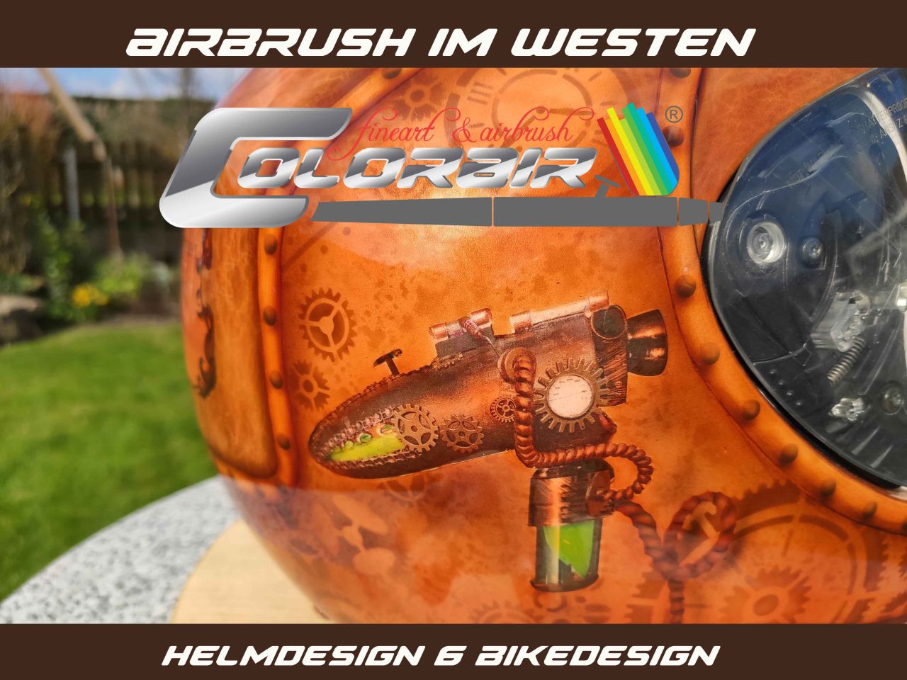 Dieser Helm enthält fast alle Techniken die wir so anwenden. Der Helm sollte mit zahlreichen Designlackierungen, Unterlack-Decaltechniken und auch Airbrush-Freihandtechniken lackiert werden. Also eine Kombination
