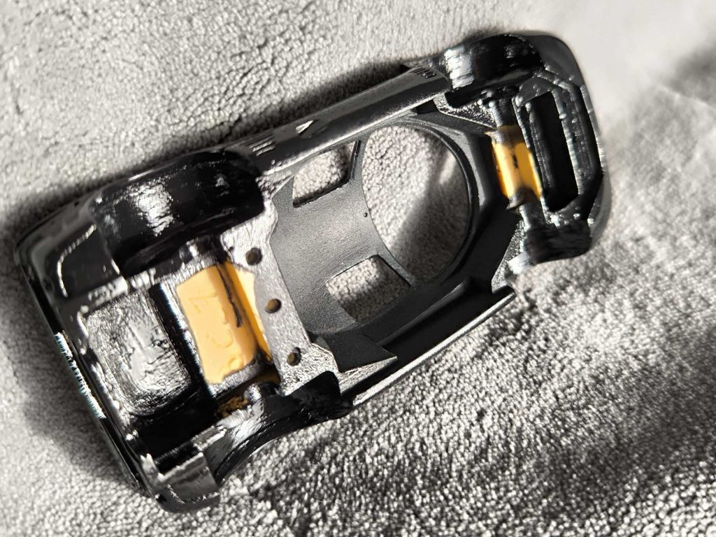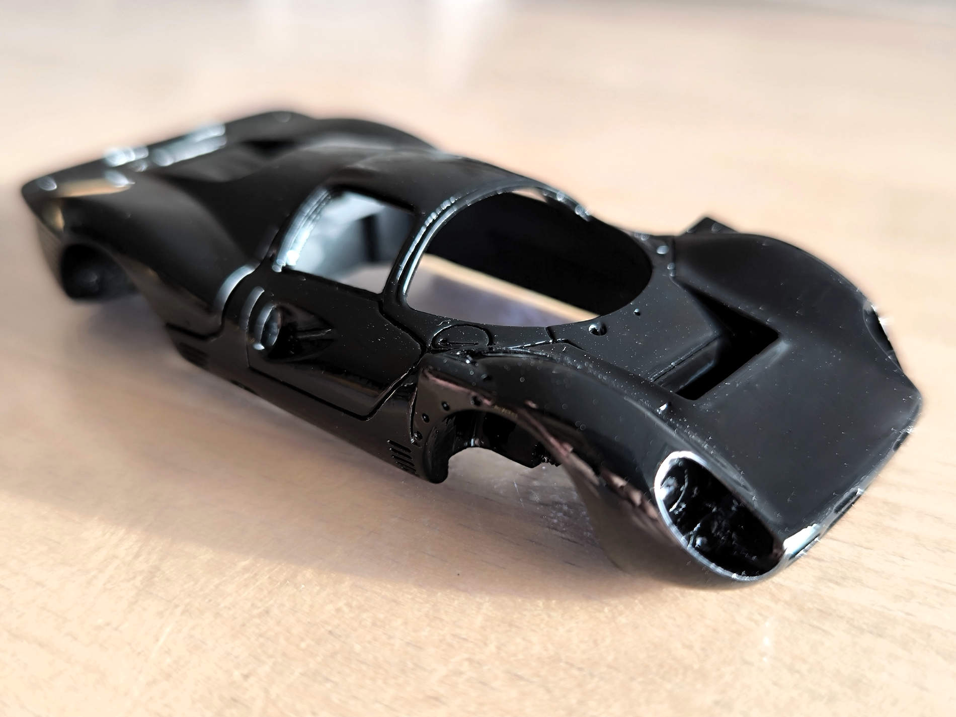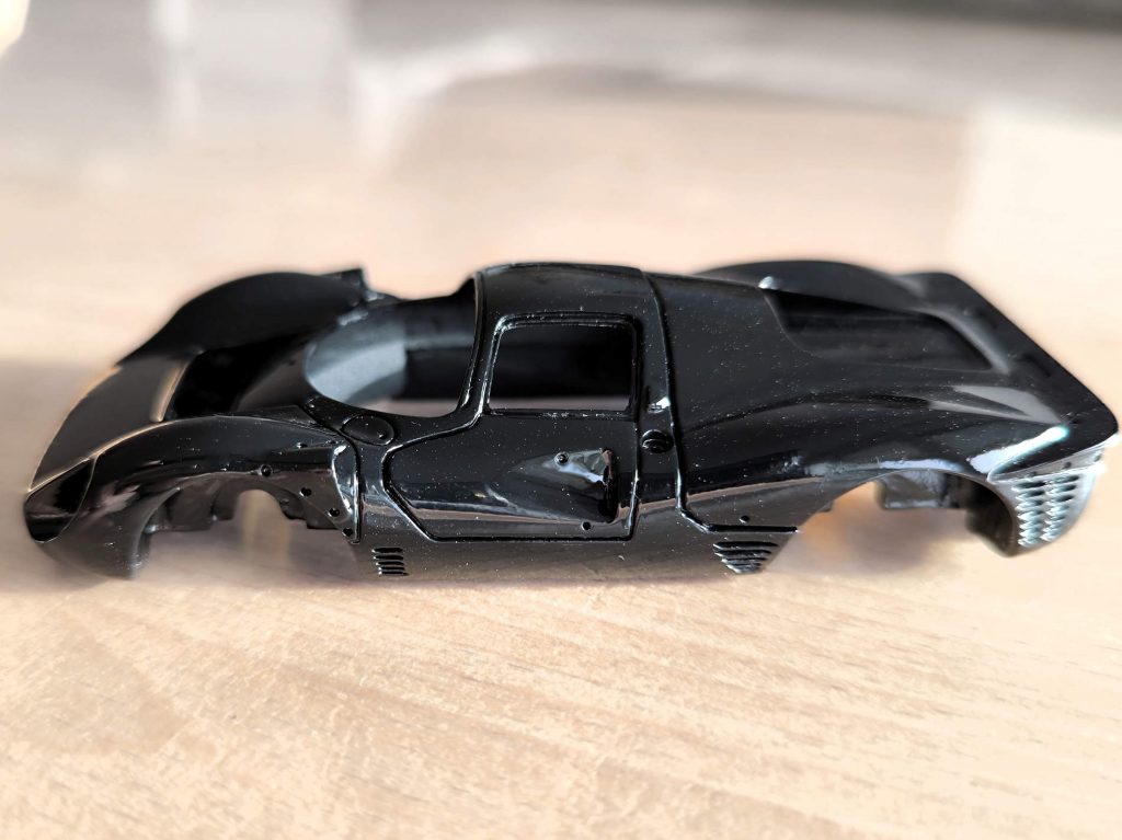 Das Modell verfügte über viele Oberflächendetails wie zB. die Spalte an Türen und Motorhaube, aber auch mehrere kleine Lüftungseinlasse sollte ebenfalls in schwarz lackiert werden. Das ist bei dieser Modellgröße nicht immer ganz einfach nur mit einer Lackierung zu erreichen. Von wurde ein mattes Lackfinish gewünscht.